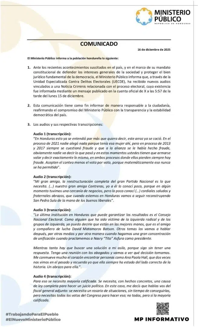 La información fue actualizada recientemente por la fiscalía, que mediante un comunicado reveló la transcripción de cuatro audios en los que se hace mención de la situación electoral que atraviesa Honduras en este momento.