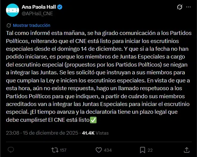 La consejera presidenta del Consejo Nacional Electoral (CNE), Ana Paola Hall, afirmó ayer 15 de diciembre a través de su cuenta oficial en X que el órgano electoral se encontraba listo para iniciar con los escrutinios especiales desde el domingo 14 de diciembre, y que si no se ha empezado es porque los miembros de las Juntas Especiales propuestos por los partidos políticos se niegan a integrar las juntas.
