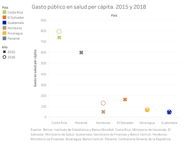 Si bien en la mayoría de los países centroamericanos se incrementó la inversión pública en salud durante el periodo 2015-2018, Guatemala, Nicaragua y Honduras tienen todavía muy bajos niveles de inversión. Mientras que Costa Rica y Panamá destinaron en el año 2018 más de US$600 por habitante a salud pública, en los países antes mencionados, los más pobres y con mayor población, la inversión fue menos de US$200. Cabe destacar que varios de esos países mantuvieron o incrementaron durante ese mismo periodo el financiamiento a las fuerzas armadas. En Honduras aumentó de US$38 a US$45 por habitante, en El Salvador se mantuvo en cerca de US$39 por persona y en Guatemala y Nicaragua fue de alrededor de US$18 y US$12 para el año 2018, respectivamente. En ausencia de conflictos armados desde hace más de 30 años y ante la magnitud de las carencias descritas, esta evolución implica desviar los recursos públicos de las necesidades y prioridades de la población.