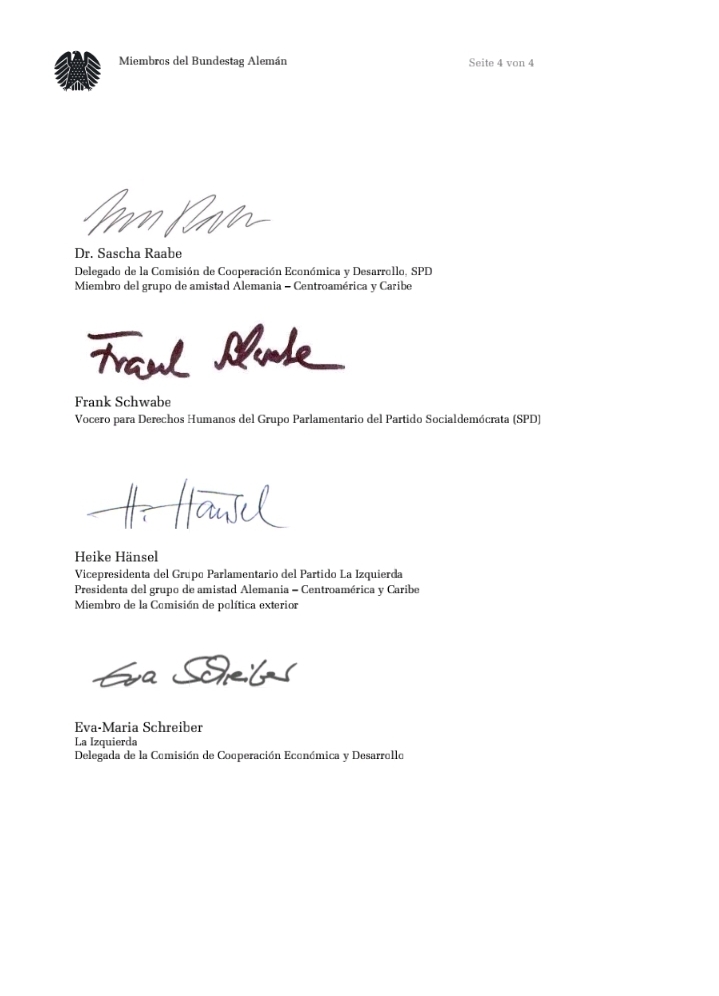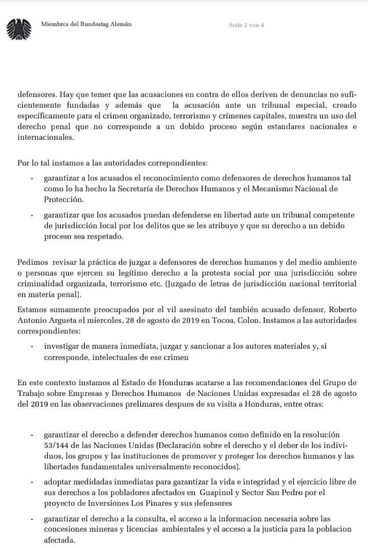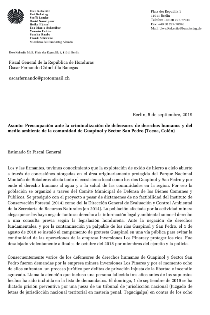 Tegucigalpa.- Un grupo de parlamentarios de Alemania enviaron una carta al Fiscal General de Honduras Oscar Chinchilla donde le hacen varios señalamientos y peticiones sobre la aplicación de la justicia en el caso de Guapinol en el municipio de Tocoa Colón.
