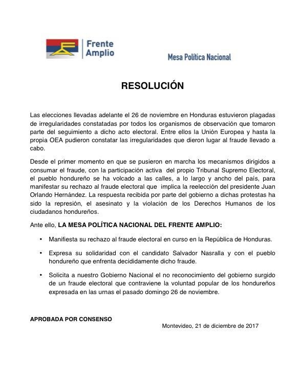 Tegucigalpa.- La mesa política del Partido Frente Amplio (FAPER) de Uruguay manifiesta que las elecciones en Honduras fueron fraudulentas y por lo tanto exigen a su gobierno no reconocer a Juan Hernández como presidente electo.