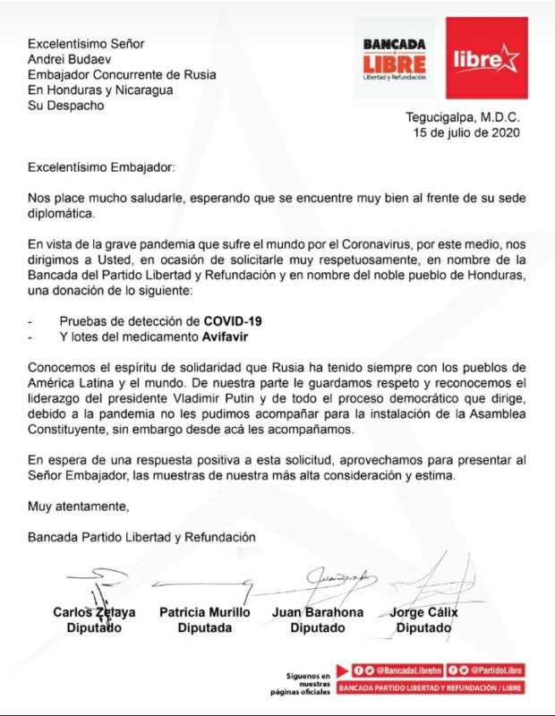 Tegucigalpa.- El Partido Libertad y Refundación (Libre), remitió una carta al gobierno ruso de Vladimir Putin solicitando ayuda en nombre del pueblo hondureño ante la catástrofe sanitaria provocada por la Covid-19 que vive Honduras ante la corrupta e inoperancia del régimen de Juan Hernández, informó el diputado Rafael Sarmiento.