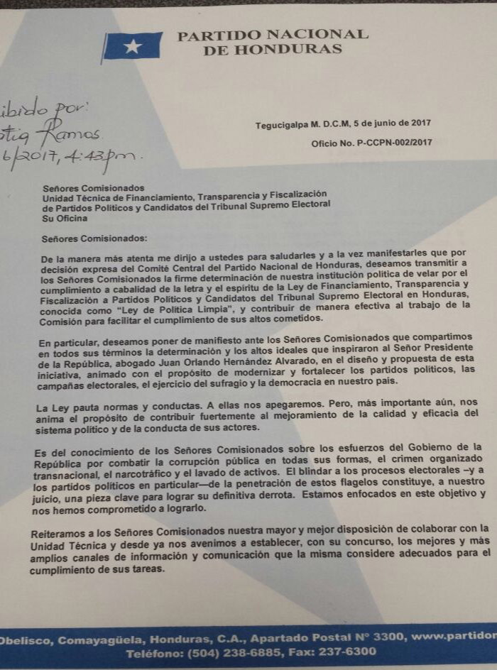 En una carta enviada a los comisionados de la Unidad Técnica de Financiamiento, Transparencia y Fiscalización de Partidos Políticos le atribuyen al presidente Juan Hernández la propuesta de la Ley de Política Limpia cuando el pueblo conoce que es una iniciativa de la Misión de Apoyo Contra la Corrupción y la Impunidad en Honduras (MACCIH).