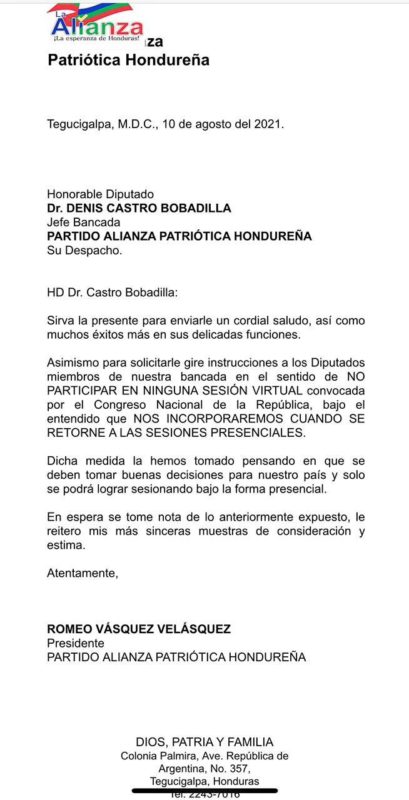 Mientras tanto el presidente del Partido Alianza Patriótica, Romeo Vásquez Velásquez, envió una carta al presidente de la bancada de su partido en el Congreso Nacional, Dennis Castro Bobadilla, indicándole que gire instrucciones a los diputados para que no participen en ninguna sesión virtual, «bajo el entendido que no se incorporarán hasta que se retorne a las sesiones presenciales», dice la carta.