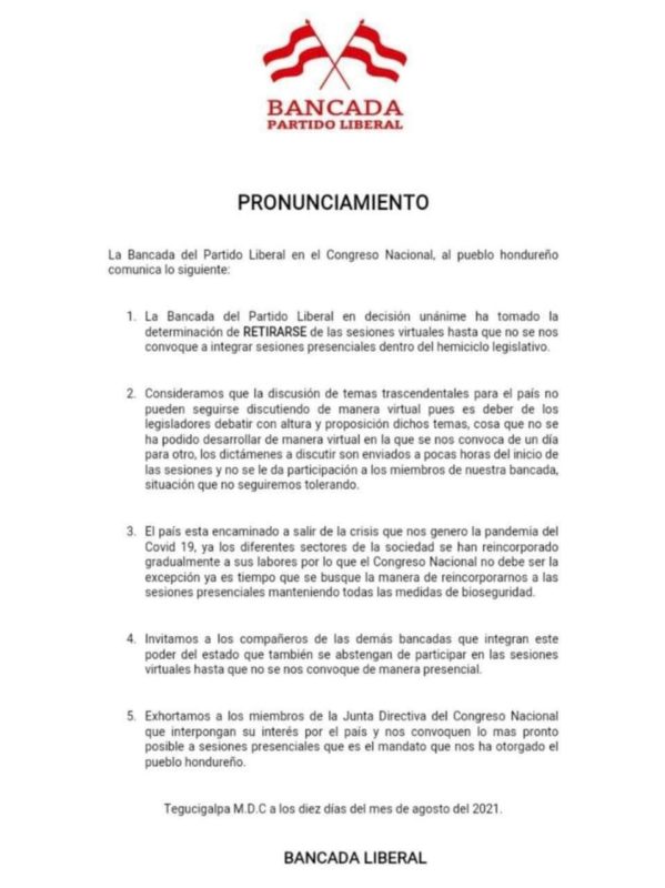 En un pronunciamiento público el Partido Liberal manifestó que se decidió de manera unánime retirarse de las sesiones virtuales hasta que los convoquen a integrar sesiones presenciales dentro del hemiciclo legislativo.