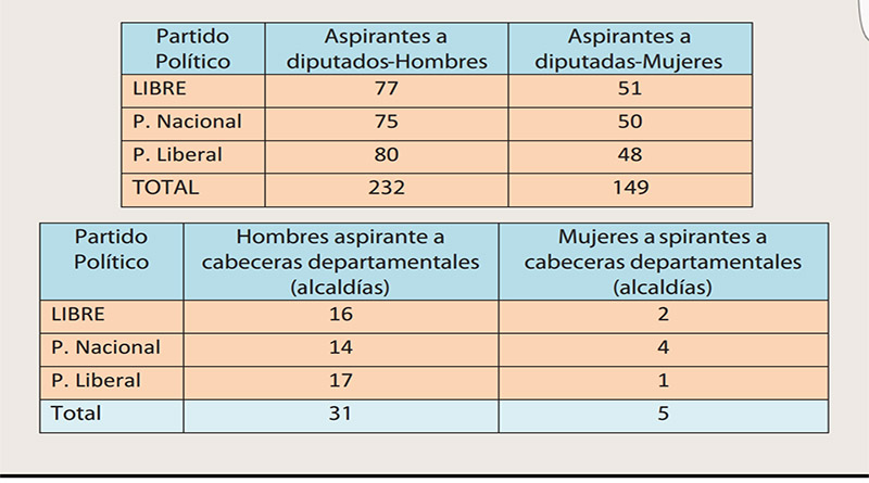En ese sentido, la Plataforma Electoral de organizaciones de la sociedad civil integrada por FOPRIDEH, ASONOG y CESPAD observa con preocupación que: No obstante lo anterior, resulta importante citar que el actual Congreso Nacional de Honduras(2014-2017) está conformado con apenas 35 mujeres, que equivalen a un 25, 7% de las y los diputado/as. Mientras, en el ámbito local, de 298 Alcaldías, solo 19 están siendo lideradas por mujeres.