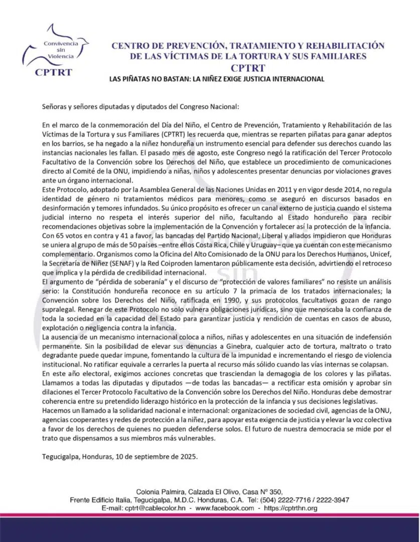 Por su parte, el Centro de Prevención, Tratamiento y Rehabilitación de las Víctimas de la Tortura y sus Familiares (CPTRT), a través de un pronunciamiento, advirtió que la falta de este mecanismo internacional coloca a la niñez en estado de indefensión y debilita la credibilidad de Honduras ante la comunidad internacional.