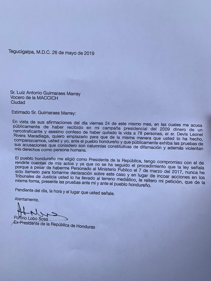 En vista de sus afirmaciones del día viernes 24 de este mismo mes, en las cuales me acusa públicamente de haber recibido dinero en mi campaña presidencial del 2009 dinero de un narcotraficante y asesino confeso de haber quitado la vida a 78 personas, el Sr. Devis Leonel Rivera Maradiaga, quiero emplazarlo para que de la misma manera que usted lo ha hecho, comparezcamos, usted y yo ante el pueblo hondureño y que públicamente exhiba las pruebas de sus acusaciones que considero son calumnias constitutivas de difamación y además violentan mis derechos como persona humana.