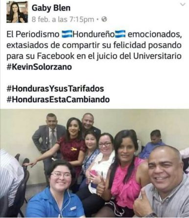 Los periodistas se encuentran molestos con la joven, también perteneciente a la agrupación de los “Indignados”, porque recientemente compartió en su muro de Facebook una fotografía en la que aparecen varios reporteros de la fuente judicial. La imagen es acompañada por los hashtag “#HondurasYsusTarifados y #HondurasEstaCambiando”.