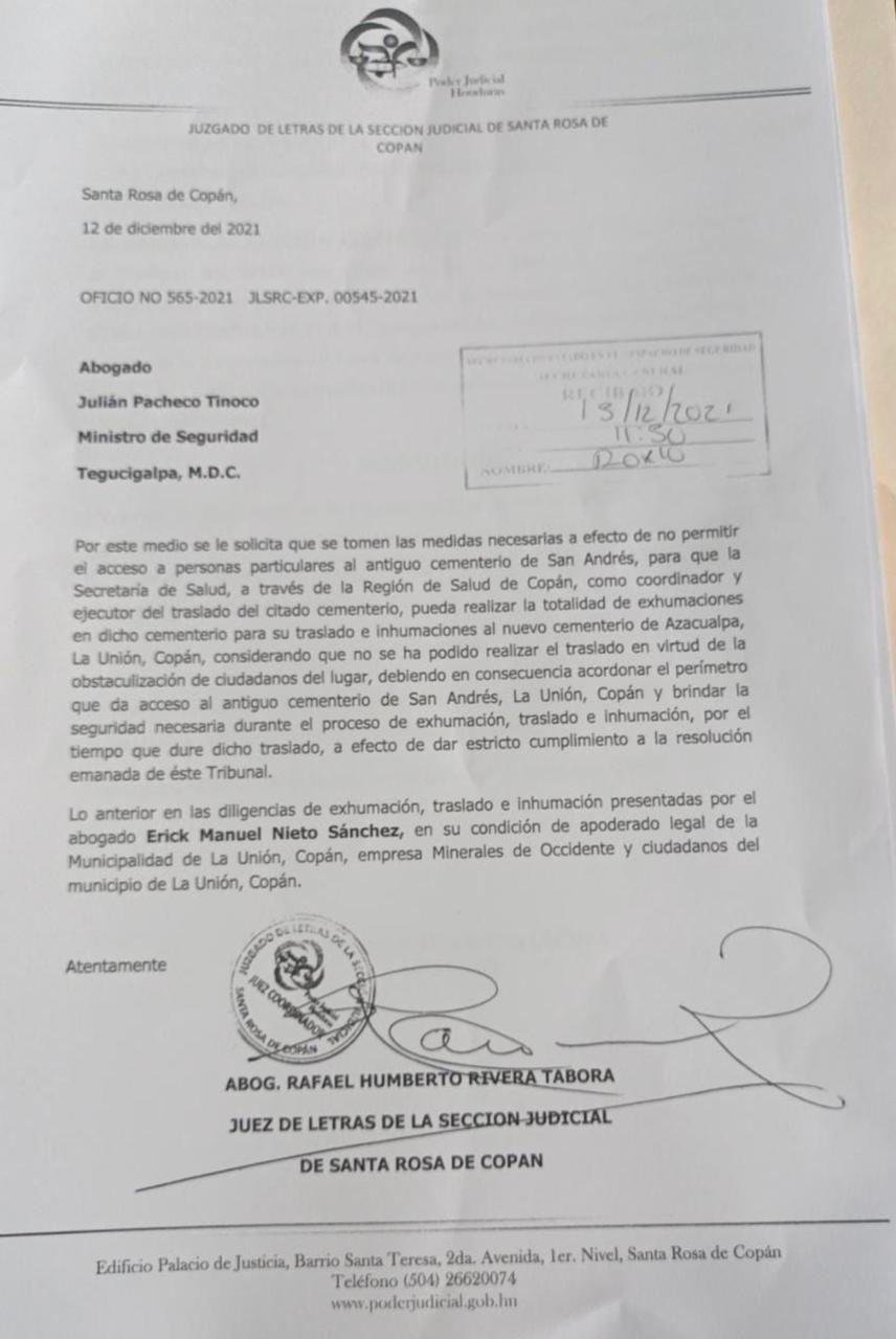 El juez de Letras Rivera Tabora de Santa Rosa de Copán emitió el 12 de diciembre el oficio número 565-2021 en el que solicita la intervención del titular de la Secretaría de Seguridad, Julián Pacheco Tinoco para que apoye las labores de la Secretaría de Salud en la totalidad de las exhumaciones, traslados y posteriores inhumaciones al nuevo cementerio de Azacualpa.