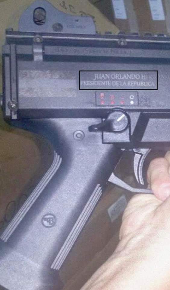 Esa arma es la prueba #203-R4 en el tráfico de drogas contra Tony Hernández en la ciudad de Nueva York. El arma supuestamente llevada por el hermano del presidente en el relieve derecho está el nombre de JUAN ORLANDO HERNÁNDEZ