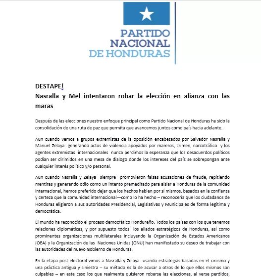 Los nacionalistas acusan al excandidato de la Alianza de Oposición, Salvador Nasralla y el expresidente de Honduras, Salvador Nasralla, de encabezar grupos extremistas para generar actos de violencia apoyados por mareros, crimen organizado, narcotráfico y agentes extremistas internacionales y de promover “falsas acusaciones de fraude, repitiendo mentiras y generando odio cono un intento premeditado para aislar a Honduras de la comunidad internacional”.