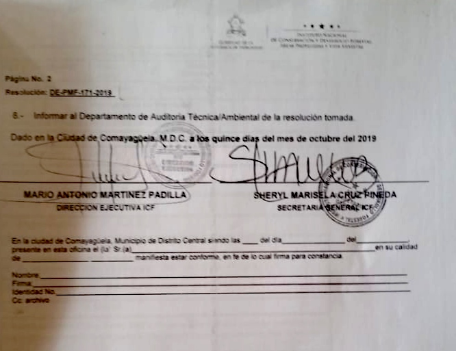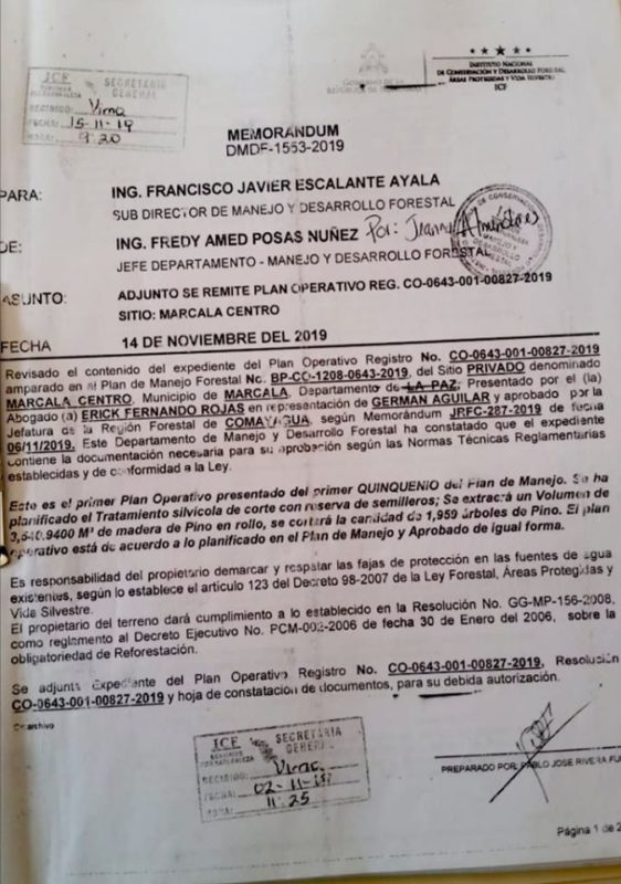 Pese al daño ambiental, la tala está consignada en el plan de manejo BP-CO-1208-0643-2019, mediante dictamen legal ASG-TT-ICF-087-2019, otorgado a favor de German Aguilar, quien ha realizado el corte de los árboles de pino con el apoyo técnico del ingeniero forestal Orlando José Rivera.