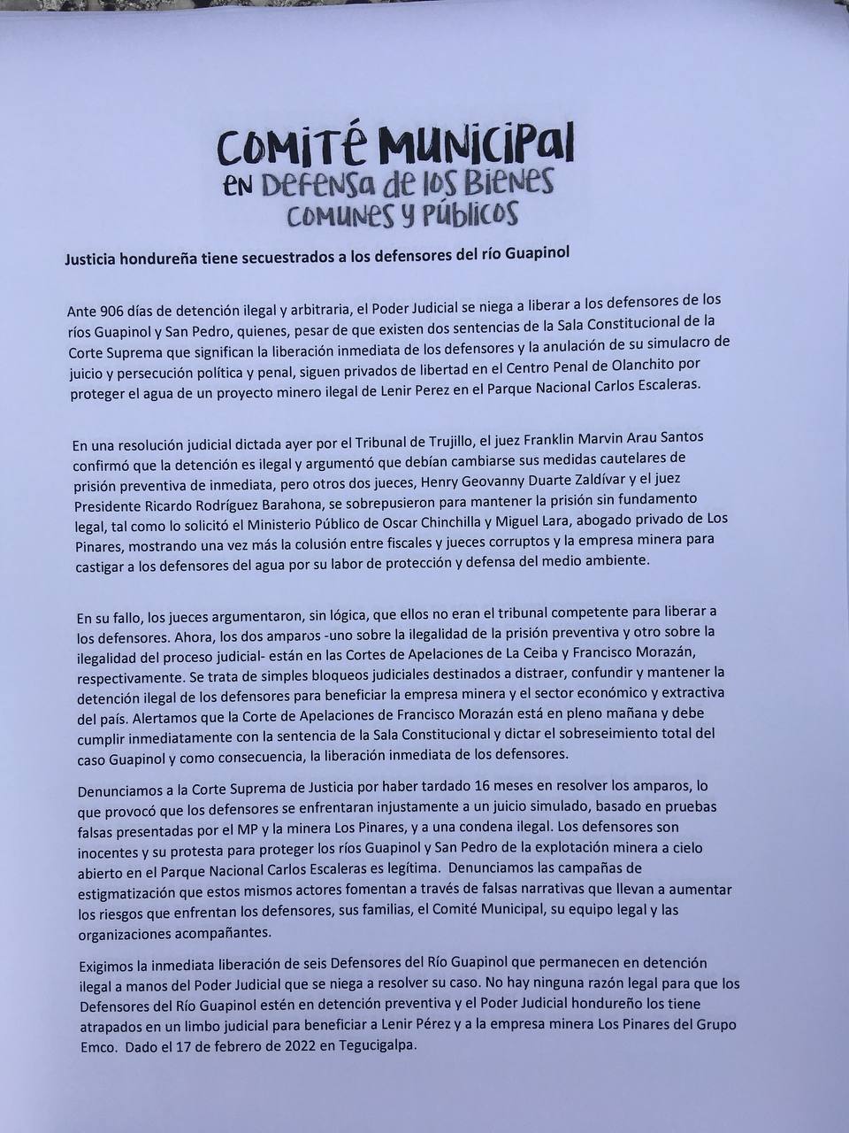 El Comité Municipal en Defensa de los Bienes Comunes y Públicos declaró a través de un comunicado que los defensores son inocentes y su protesta para proteger los ríos Guapinol y San Pedro de la explotación minera a cielo abierto en el Parque Nacional Carlos Escaleras es legítima.