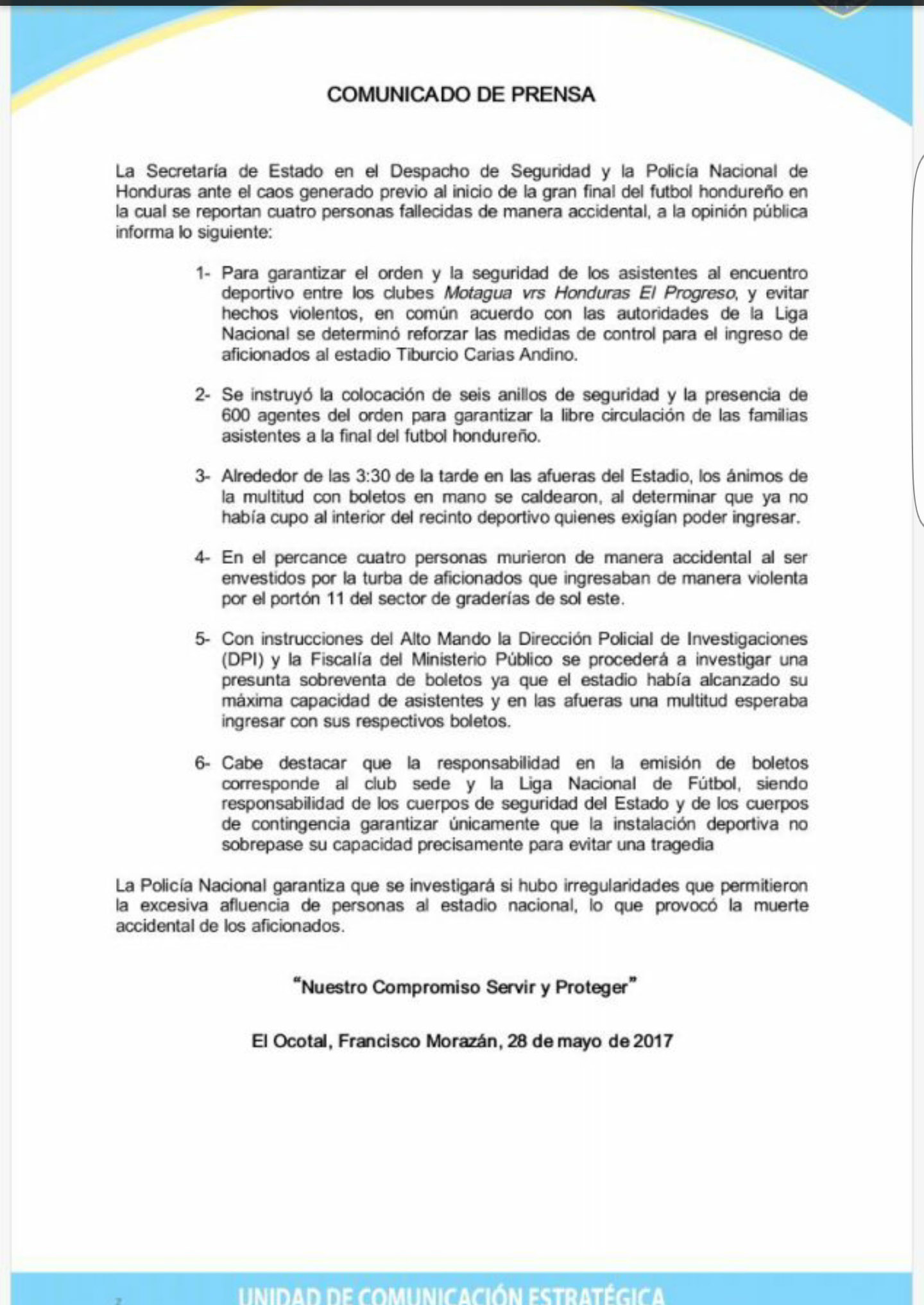 El comunicado reza que para garantizar el orden y la seguridad de los asistentes al encuentro deportivo y evitar hechos violentos, en común acuerdo con las autoridades de la Liga Nacional se determinó reforzar las medidas de control para el ingreso de aficionados al estadio y se instruyó la colocación de seis anillos de seguridad y la presencia de 600 agentes del orden para garantizar la libre circulación de las familias asistentes a la final del fútbol hondureño.