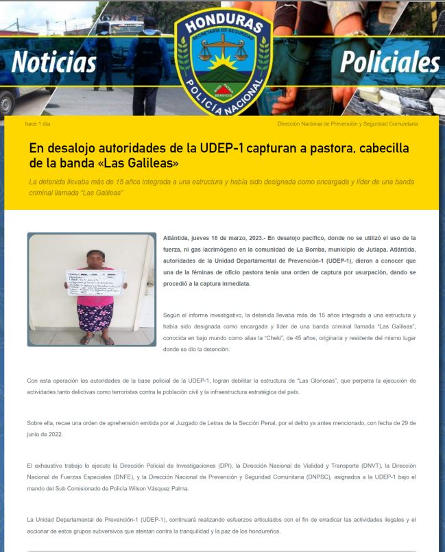 Esta vez, en un claro discurso que recuerda el utilizado por las fuerzas de seguridad durante el régimen de Juan Orlando Hernández, se expuso con bombos y platillos ante los medios de comunicación a una lideresa campesina como la cabecilla de “una banda criminal”.