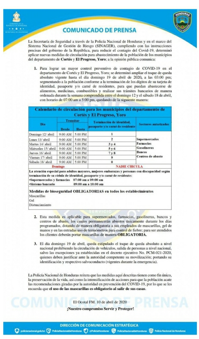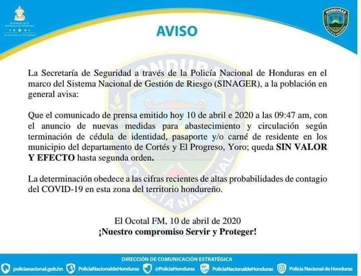 Primer comunicado del viernes 10 de abril que facultaba la salida para los vecinos del departamento de Cortés y el municipio de El Progreso Yoro.