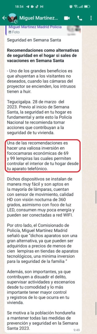 “Una de las recomendaciones es hacer una valiosa inversión en «foco cámaras» económicas de 69 y 99 lempiras las cuales permiten controlar el interior de tu hogar desde tu aparato telefónico”, cita el texto difundido por el Comisionado de Policía, Miguel Martínez Madrid, director de Comunicación Estratégica de la Secretaría de Seguridad.