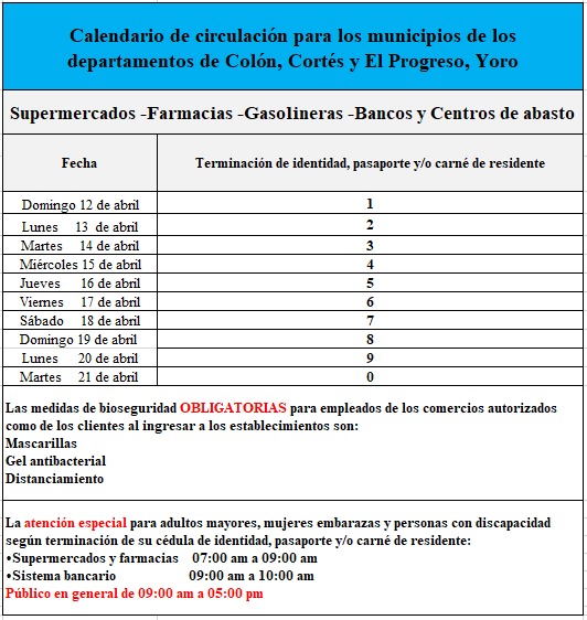 Tegucigalpa.- Luego del estira y encoje en la prohibición de salida a los pobladores de los departamentos de Cortés, Colón y el municipio de El Progreso, departamento de Yoro, la policía reprogramó las salidas desde el domingo 12 hasta el martes 21 de abril del presente año.