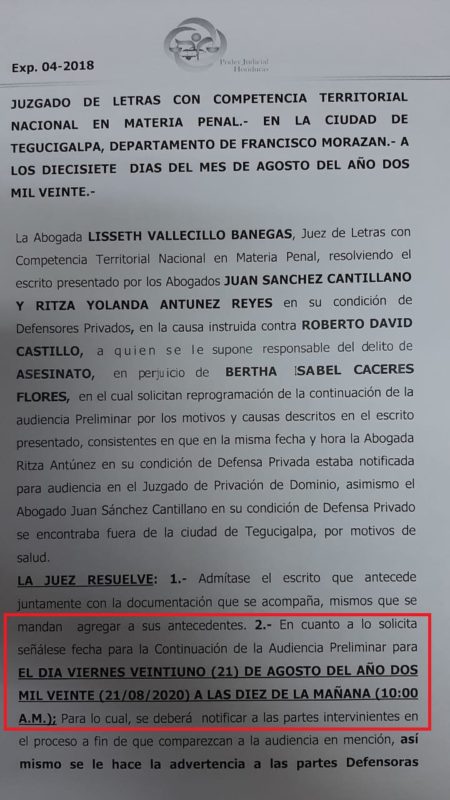La audiencia preliminar fue reprogramada por acciones de la defensa de Castillo para el viernes 21 de agosto en el Juzgado Anticorrupción, ubicado en el bulevar Los Próceres de Tegucigalpa, departamento de Francisco Morazán, zona central de Honduras.