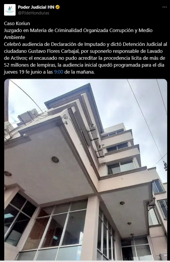 Tegucigalpa, Honduras. – El Juzgado de Letras con competencia en Criminalidad Organizada, Medioambiente y Corrupción dictó detención judicial contra Gustavo Flores Carbajal, administrador de la sucursal de Koriun Inversiones en Choluteca, tras celebrar la audiencia de declaración de imputado celebrada ayer domingo 15 de junio.