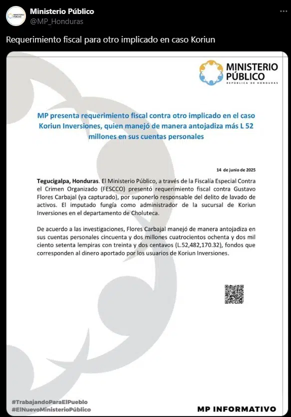 Flores Carbajal se convierte en el cuarto imputado en el caso Koriun Inversiones, sumándose a Iván Velásquez Castro (gerente general), Kefi Esmeralda Gavarrete Sánchez (administradora y esposa de Velásquez, quien cumple arresto domiciliario) y Marcos Abel Villeda Galdámez (empleado de contabilidad), todos acusados por la Fiscalía Especial Contra el Crimen Organizado (FESCCO) por el delito de lavado de activos.