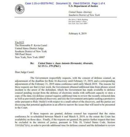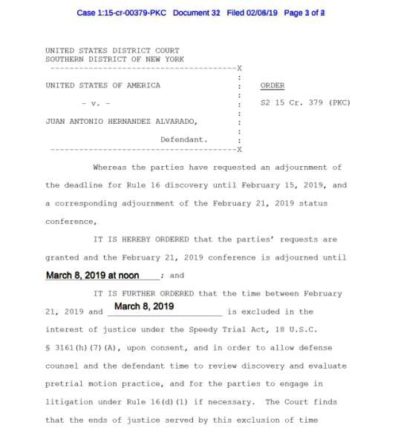 Ante la solicitud hecha por la fiscalía, el juez Kevin Castel decidió reprogramar la audiencia para el próximo 8 de marzo, en horas del mediodía. Y con esa resolución da espacio de un mes para analizar las evidencias encontradas. Asimismo, para que se establezcan las acciones a favor de la defensa de Hernández.