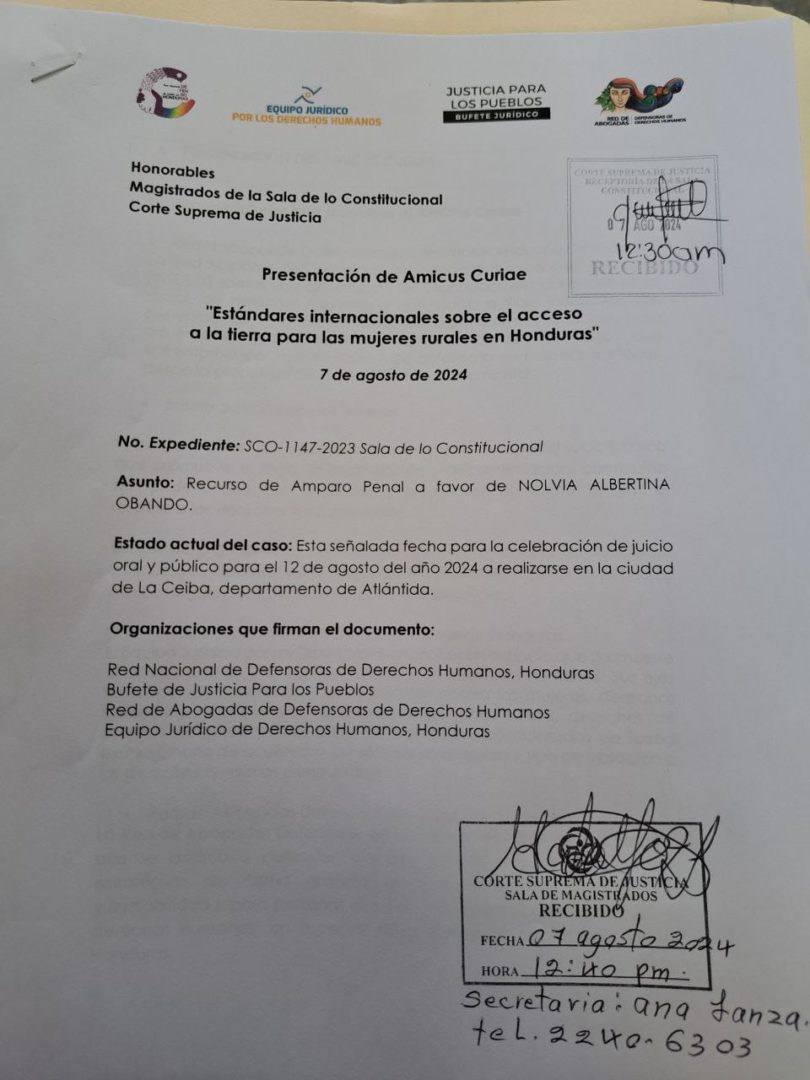 El amicus curiae se enmarca en el proceso judicial contra Nolvia Obando, una defensora y campesina acusada de usurpación en Honduras. La defensa de Obando presentó un amparo en julio de 2023, recurso que hasta la fecha no ha sido resuelto y que, de acuerdo con las abogadas, podría detener la criminalización a que se ha sometido a Obando.