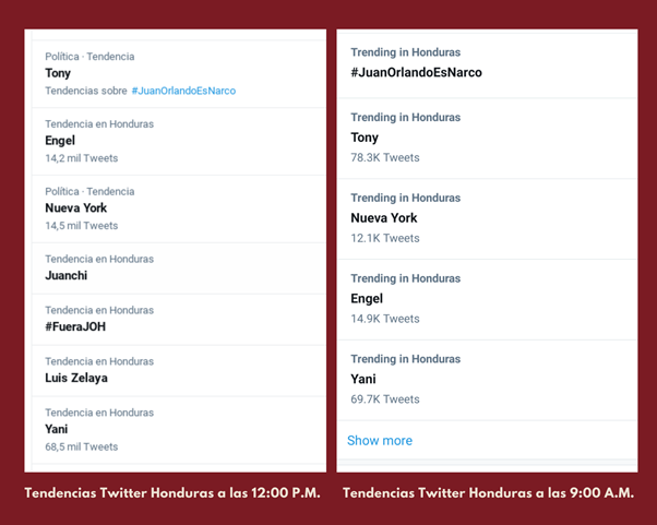 Las tendencias en Twitter Honduras este 30 de marzo están enfocadas en la sentencia contra Antonio Hernández y la publicación de la Lista Engel. El hashtag #JuanOrlandoEsNarco fue tendencia en horas de la mañana y al mediodía continuaba siendo tendencia en relación con la designación «Tony». Posteriormente, a la 1:30 P.M. nuevamente el hashtag #Juan mencionado volvió a liderar como tendencia.