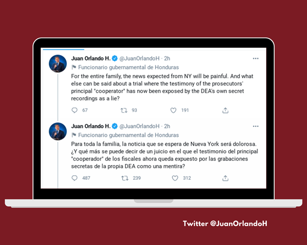 Tegucigalpa. El presidente Juan Hernández mantiene la narrativa que los testimonios que pesan contra su hermano Antonio Hernández en la Corte del Distrito Sur de Nueva York, y por consiguiente él, son falsos. Esto último lo volvió a exponer en un tuit que publicó previo al anuncio de la sentencia contra su hermano.