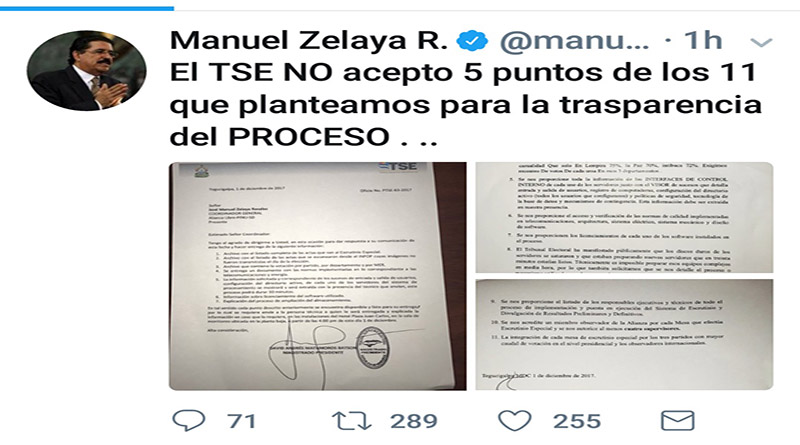 Tegucigalpa.- El magistrado presidente del Tribunal Supremo Electoral (TSE), David Matamoros Batson, respondió al coordinador de la Alianza de Oposición y solo aceptó 6 de los once puntos planteados por la Alianza de Oposición, dijo en su cuenta de Twitter Manuel Zelaya Rosales, coordinador de la oposición.