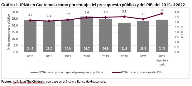 Esto lleva a la pregunta, ¿Qué han hecho los Gobiernos para proteger a la niñez y adolescencia de estas crisis? Para el caso de Guatemala, la evolución de la inversión pública en la niñez y adolescencia (IPNA) muestra que no ha existido un incremento en la prioridad que el Estado otorga a las inversiones públicas destinadas a este grupo etario. En el 2015 la IPNA representaba el 24.2% del presupuesto público y el 3.2% del PIB, para el 2021, representaba el 23.5% y el 3.3%, respectivamente, prácticamente invariable; para el 2022, el presupuesto vigente a junio muestra que esta tendencia no variará en gran medida. La IPNA en Guatemala se caracteriza por ser insuficiente: en el 2021 fue de Q9.1 diarios (USD1.2) por cada niño y adolescente, cifra que, descartando los efectos de la inflación, solamente aumentó 90 centavos en seis años, aproximadamente 15 centavos cada año.