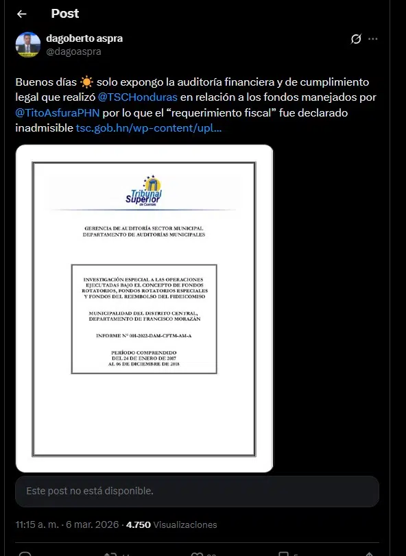 El debate surge porque Aspra Iglesias encabeza la Procuraduría General de la República (PGR), institución encargada de la representación legal del Estado hondureño, publicó un mensaje en su cuenta de X –antes Twitter— acompañado de una auditoría financiera del Tribunal Superior de Cuentas (TSC) sobre los fondos manejados por Asfura –afirmando— que por ello el requerimiento fiscal fue declarado inadmisible, la cual concluyó sin establecer responsabilidades penales contra Asfura.