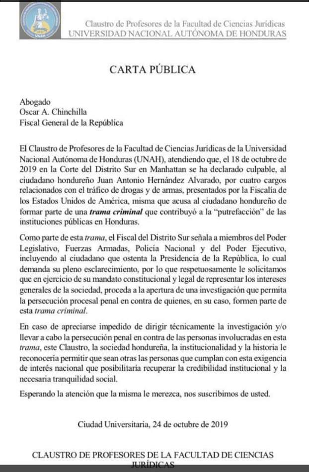 La carta de los profesores de derecho relata que Juan Antonio Hernández Alvarado fue encontrado culpable de cuatro cargos relacionados con el tráfico de drogas y de armas y además se señaló a su hermano Juan Orlando Hernández, que funge como presidente de Honduras, de ser su cómplice.