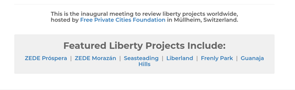 La fundación Free Private Cities señala que la conferencia es la reunión inaugural para revisar proyectos de libertad en todo el mundo, de los cuales se promocionan seis, tres de los cuales se encuentran en Honduras.