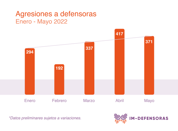 En lo que va de enero a mayo de 2022, la Iniciativa Mesoamericana registró un total de 1,466 agresiones contra 331 defensoras, con un promedio de 300 agresiones contra defensoras por mes. En enero se reportaron 294 agresiones contra defensoras, en febrero 192, en marzo 337, en abril 417 y en mayo 371.