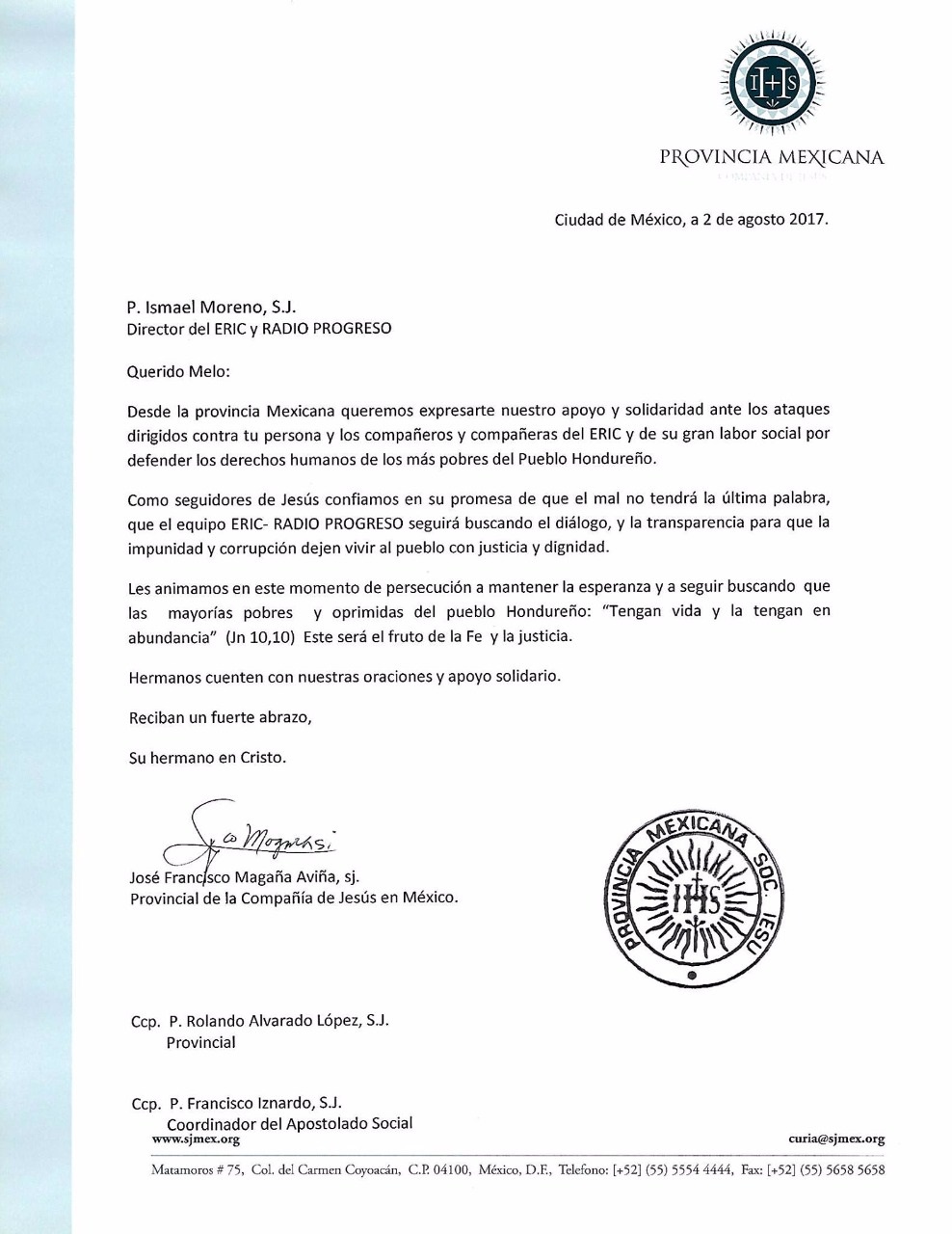 Tegucigalpa.- El provincial de la Compañia de Jesús en Mexico, José Francisco Magaña Aviña sj, se solidarizó con el padre Melo (Ismael Moreno) y el equipo del ERIC y Radio Progreso.