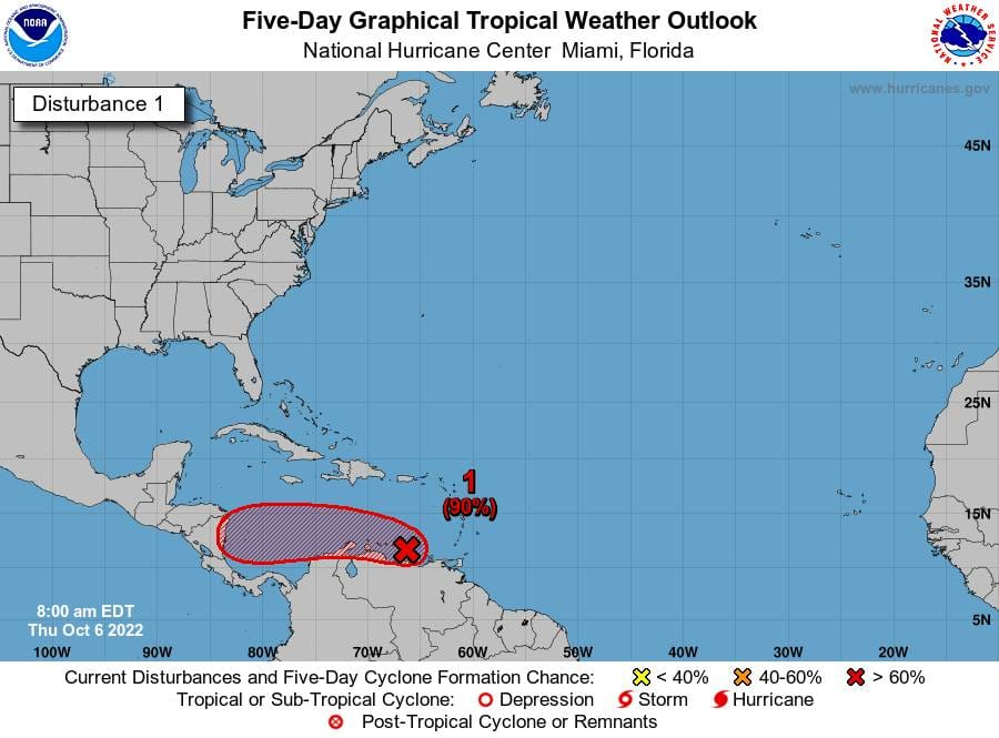 Este disturbio tropical se desplaza hacia el oeste del Mar Caribe con una velocidad entre 20 y 24 kilómetros por hora.