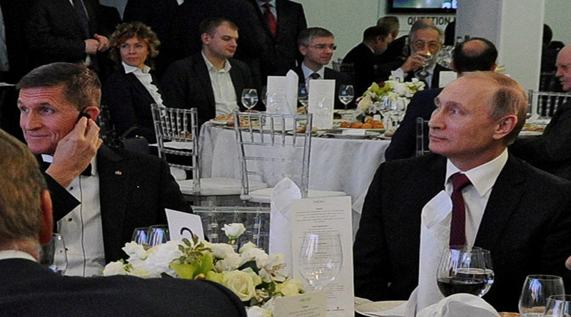 En los medios estadounidenses se difundió una foto en la que el exasesor presidencial de Seguridad Nacional, Michael Flynn, y el presidente ruso están sentados juntos durante una cena en el marco del décimo aniversario de RT en 2015. Al comentar su relación con Flynn, Putin señaló que apenas habló con él durante el evento.