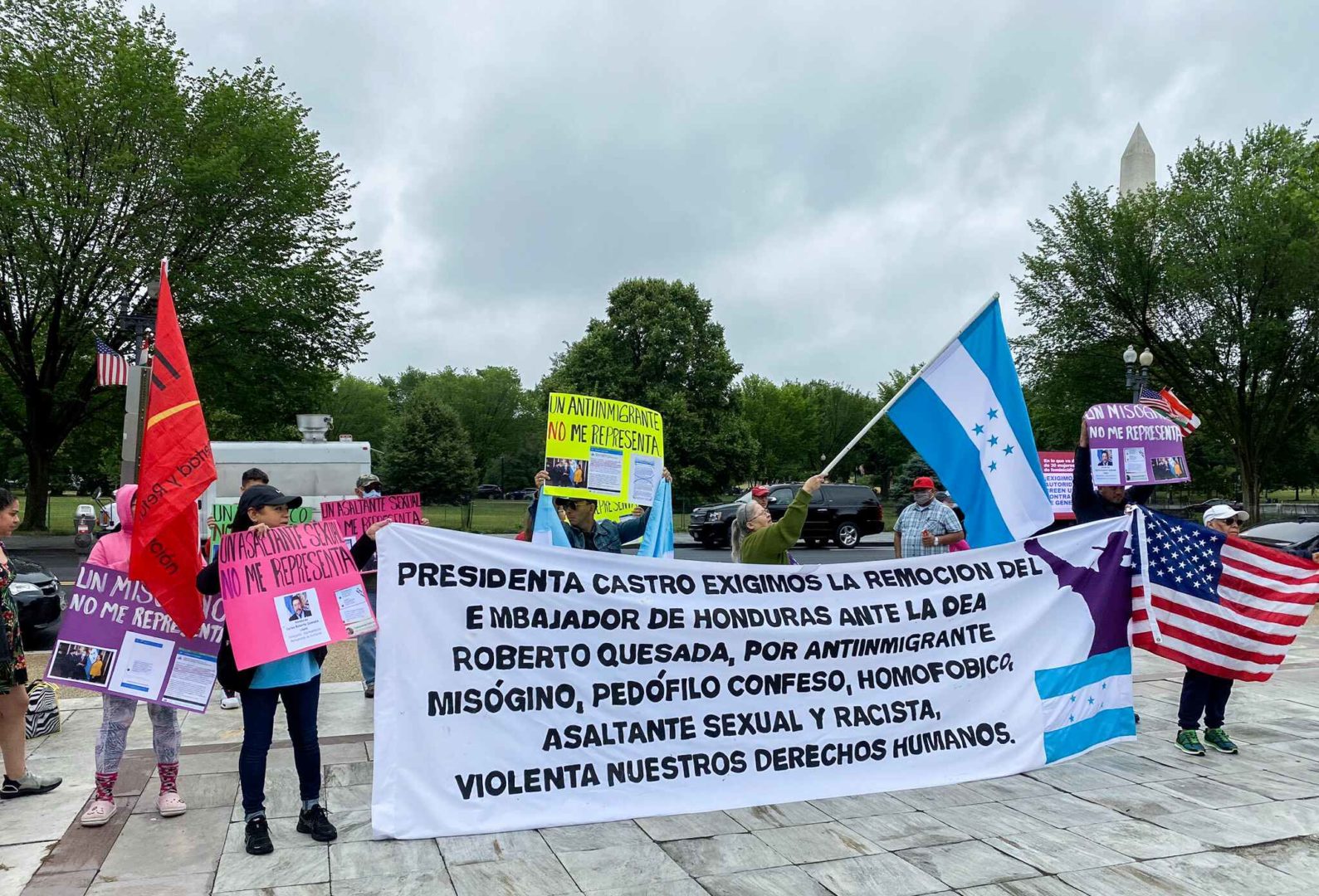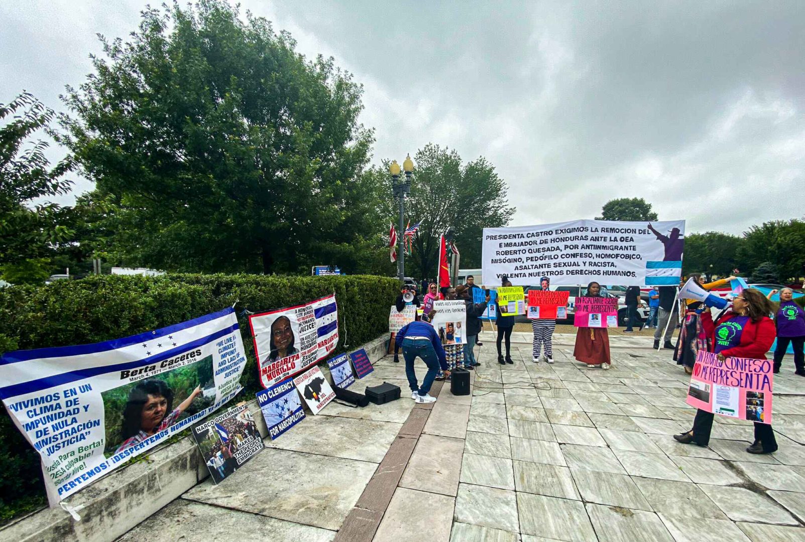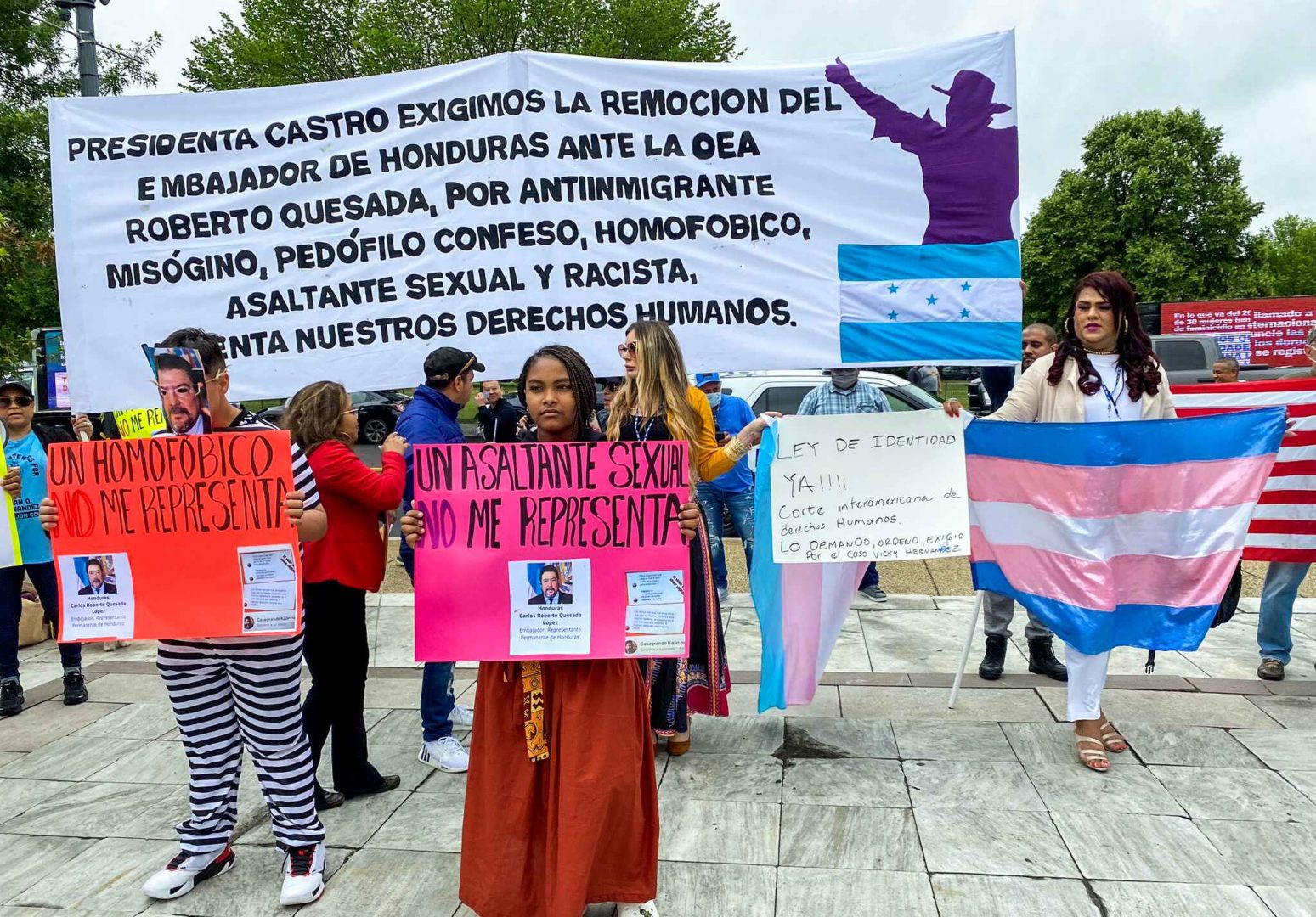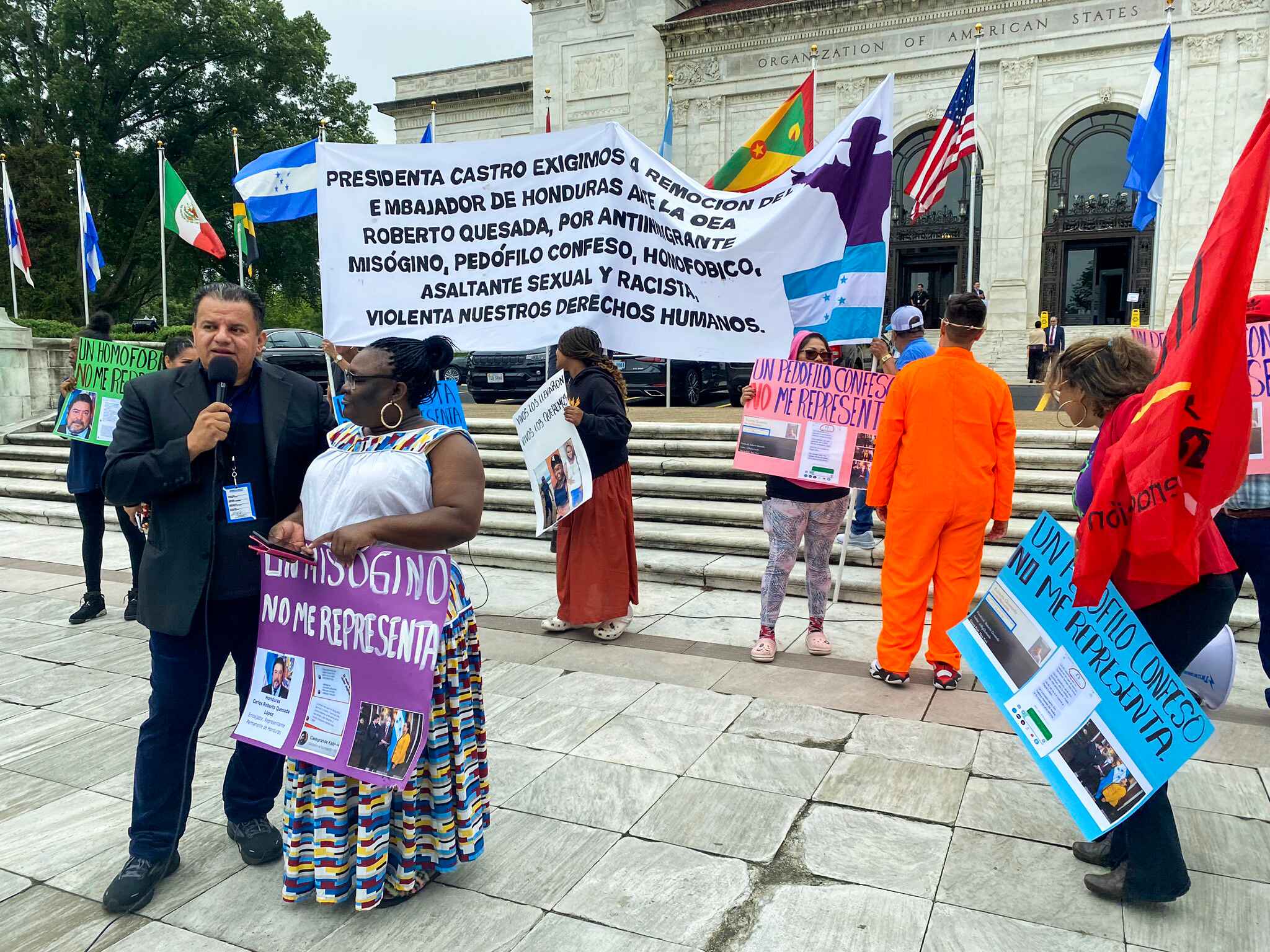 Un grupo de hondureños se dio cita, el jueves 22 de junio, frente a la sede de la OEA en Washington D.C. para exigir a Xiomara Castro la destitución del diplomático. Los asistentes al plantón mostraron eufóricamente su descontento en pancartas que mencionan las acciones cometidas por Quesada. También asistieron personas de la comunidad garífuna pidiendo respuesta al gobierno por la desaparición forzada, en 2020, de los cuatro jóvenes garífunas de la comunidad de el Triunfo de la Cruz, municipio de Tela, en el departamento de Atlántida. En la protesta participaron también representantes de la comunidad LGBTIQ+, quienes exigieron a la presidenta Xiomara Castro el cumplimiento de sus promesas en torno a sus derechos.