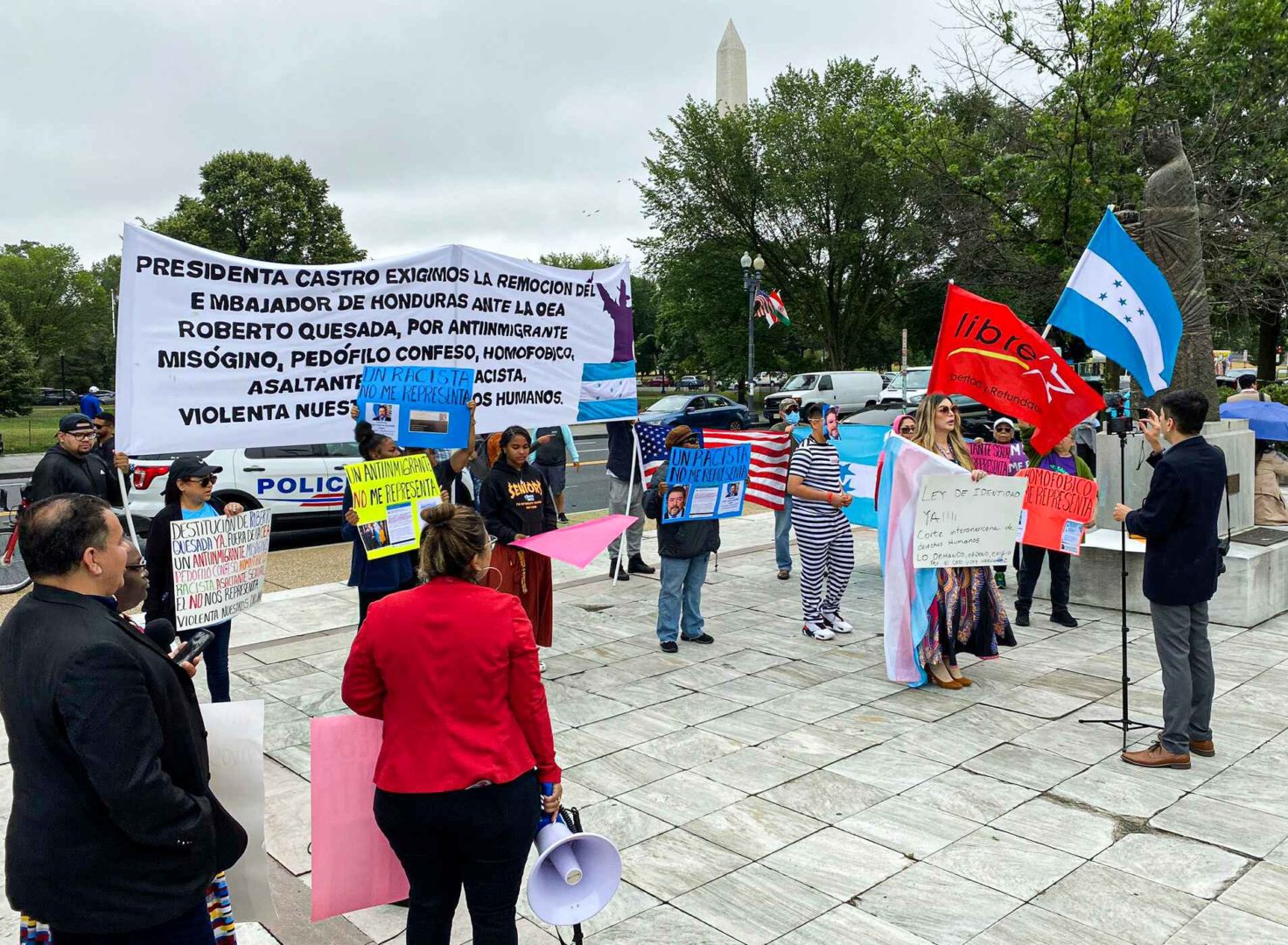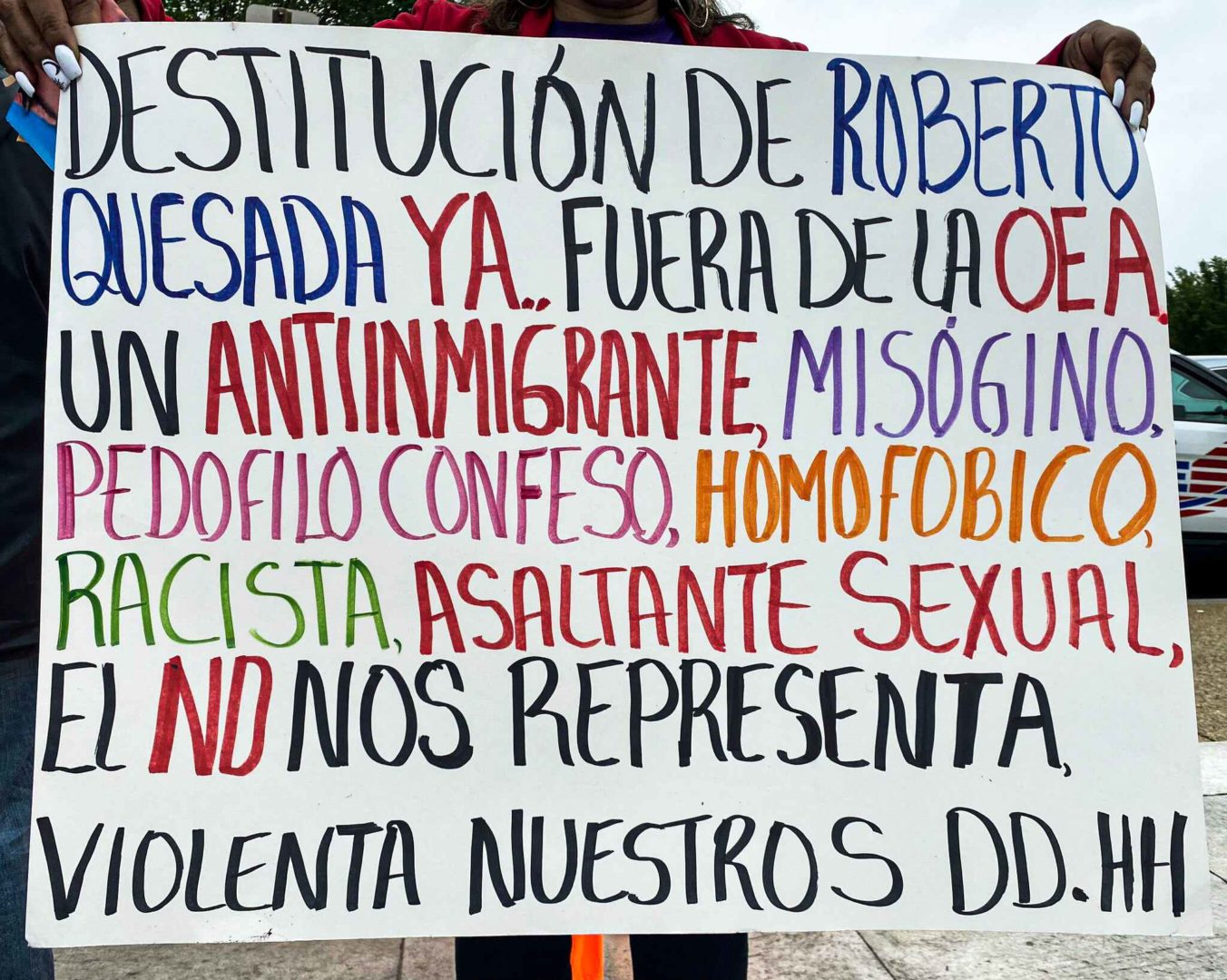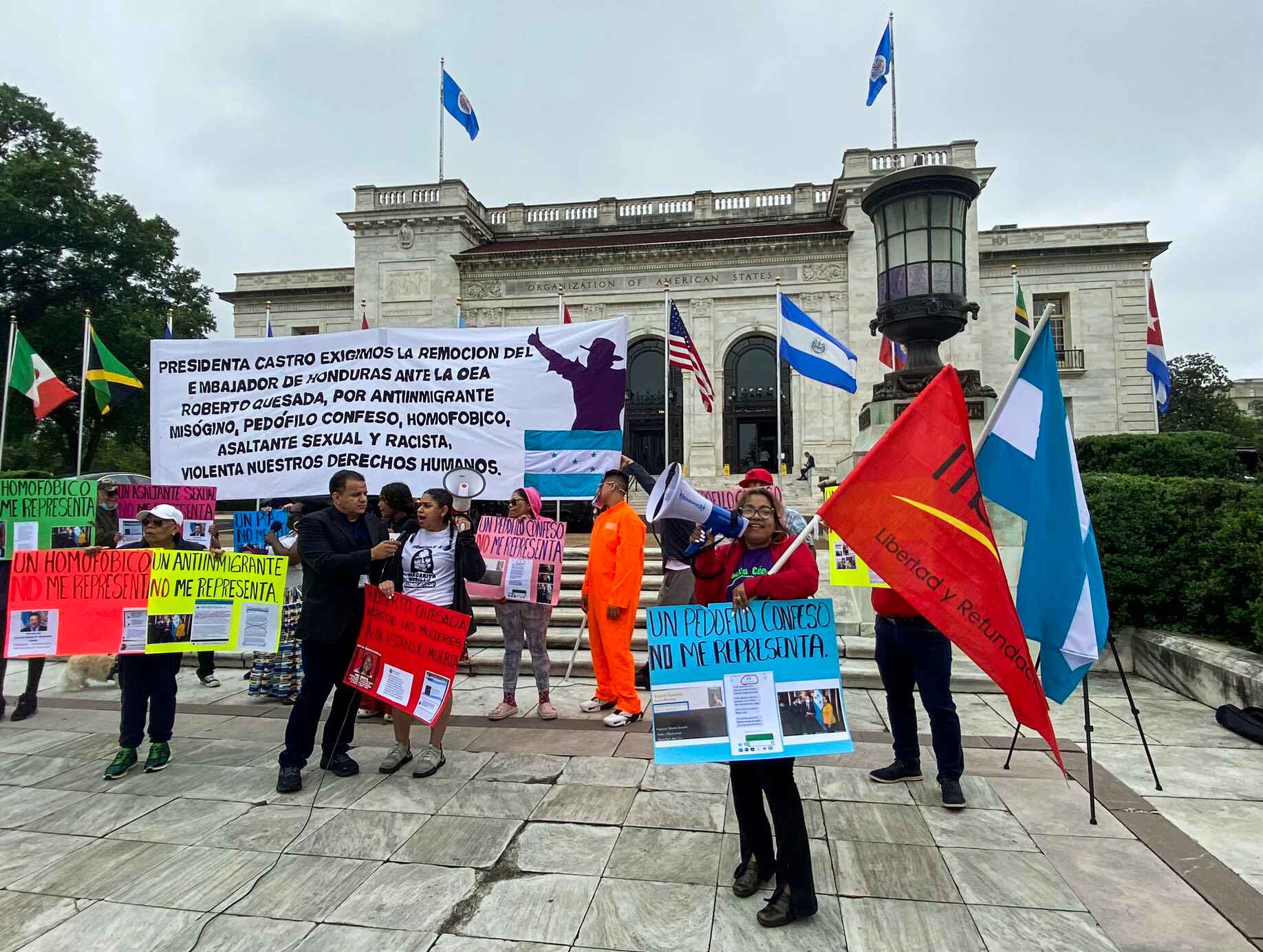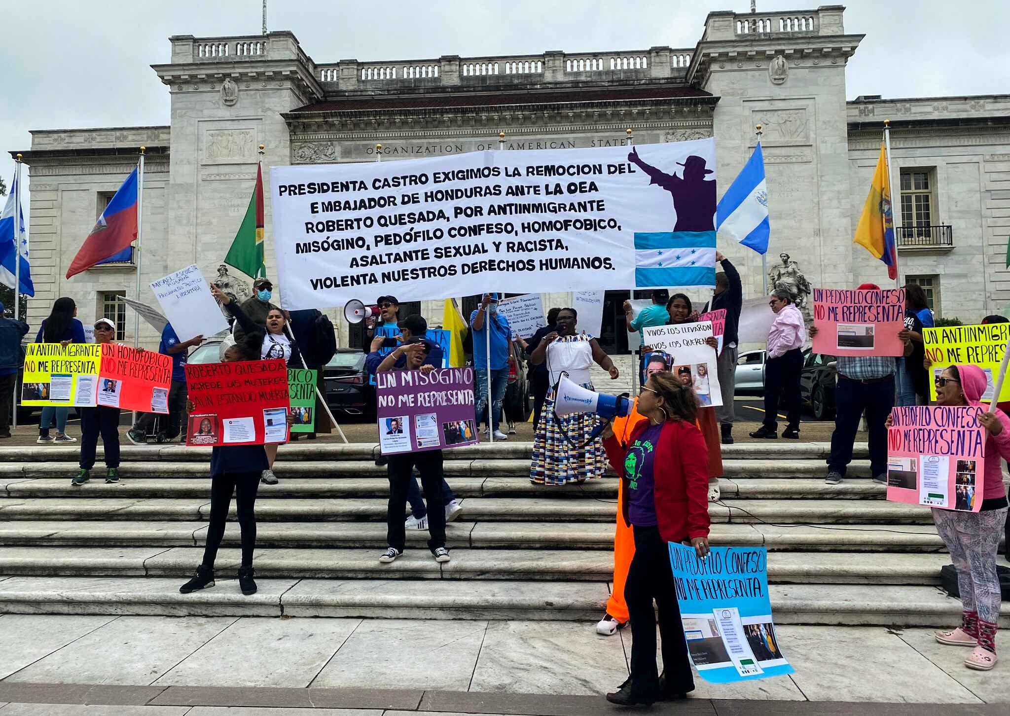 Un grupo de hondureños se dio cita, el jueves 22 de junio, frente a la sede de la OEA en Washington D.C. para exigir a Xiomara Castro la destitución del diplomático. Los asistentes al plantón mostraron eufóricamente su descontento en pancartas que mencionan las acciones cometidas por Quesada. También asistieron personas de la comunidad garífuna pidiendo respuesta al gobierno por la desaparición forzada, en 2020, de los cuatro jóvenes garífunas de la comunidad de el Triunfo de la Cruz, municipio de Tela, en el departamento de Atlántida. En la protesta participaron también representantes de la comunidad LGBTIQ+, quienes exigieron a la presidenta Xiomara Castro el cumplimiento de sus promesas en torno a sus derechos.