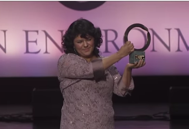 En 2015, Bertha Cáceres recibió el Premio Medioambiental Goldman, uno de los galardones más prestigiosos para activistas del medio ambiente. Fue reconocida por su campaña de base que logró que el constructor de represas más grande del mundo se retirara del proyecto de la represa Agua Zarca en el río Gualcarque. Este premio es un testimonio de su valiente defensa del hábitat y los derechos del pueblo lenca y su lucha contra la construcción de la represa que amenazaba la sagrada fuente de agua y vida para su comunidad.