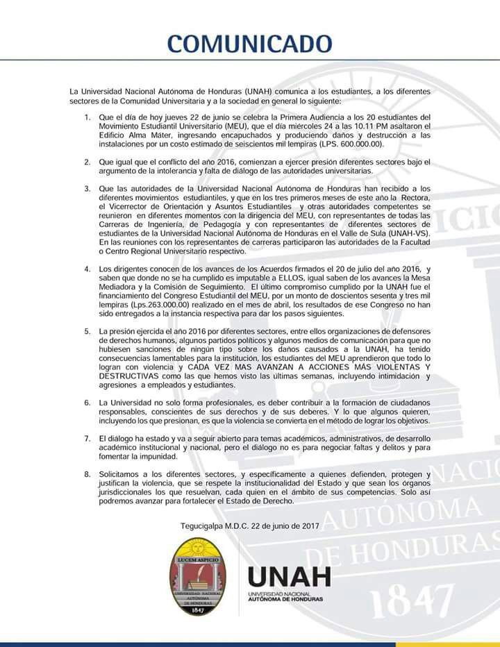 En el cuarto párrafo de su comunicado culpan a los estudiantes del MEU de ser los responsables que los puntos acordados el 20 de julio del año pasado y que el último compromiso cumplido fue el financiamiento del congreso estudiantil en el pasado mes de abril con mas de 263 mil lempiras.