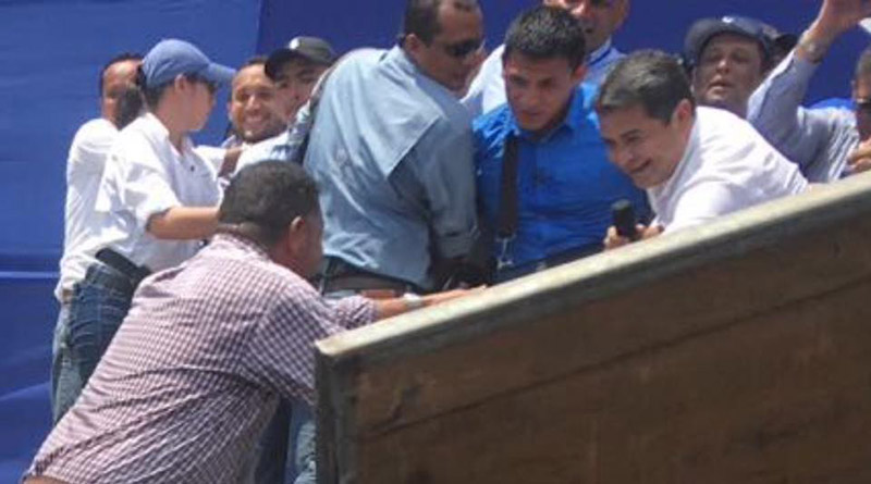 “Arriba banderas”, expresó Hernández cuando de repente se escucharon los gritos despavoridos al ver que iban hacia abajo. ¡Tranquilos, tranquilos, todo bien…arriba, arriba. Es el peso del gran Partido Nacional de Honduras!, exclamó el gobernante para tranquilizar a sus seguidores.