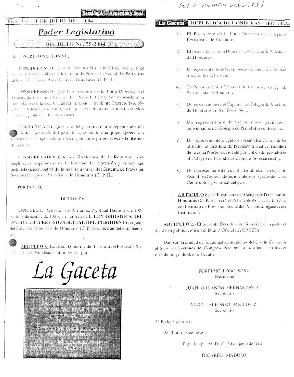 “Artículo 1 .- Interpretar el Artículo 2 y 64 del Decreto No. 190-85 del 30 de noviembre de 1985, conocida como “Ley del Instituto de Previsión Social del Periodista”, en el sentido de que siendo un organismo de derecho público no estatal gremial sin fines de lucro, dedicado a la prestación de beneficios sociales de conformidad a su Ley, no le son aplicables las normas contenidas en las leyes de la República en cuanto a control, supervisión y vigilancia de sus operaciones financieras y administrativas”, reza el decreto 59-2000 publicado en La Gaceta el 30 de mayo del 2000.