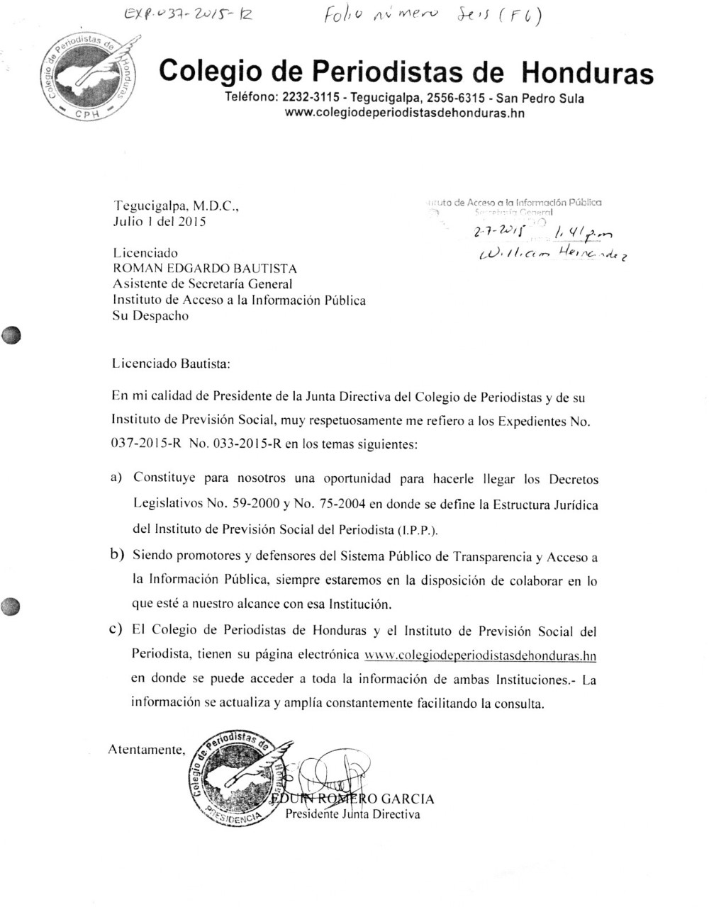 Romero García, ante peticiones de información del periodista y afiliado del IPP, Gustavo Palencia, canalizadas a través del IAIP se negó a entregar lo solicitado y respondió al órgano encargado de velar por la transparencia pública, enviando los decretos 59-2000 y el 75-2004.