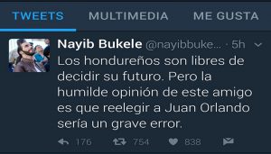 El mensaje exacto dice: “Los hondureños son libres de decidir su futuro. Pero la humilde opinión de este amigo es que reelegir a Juan Orlando sería un grave error”.