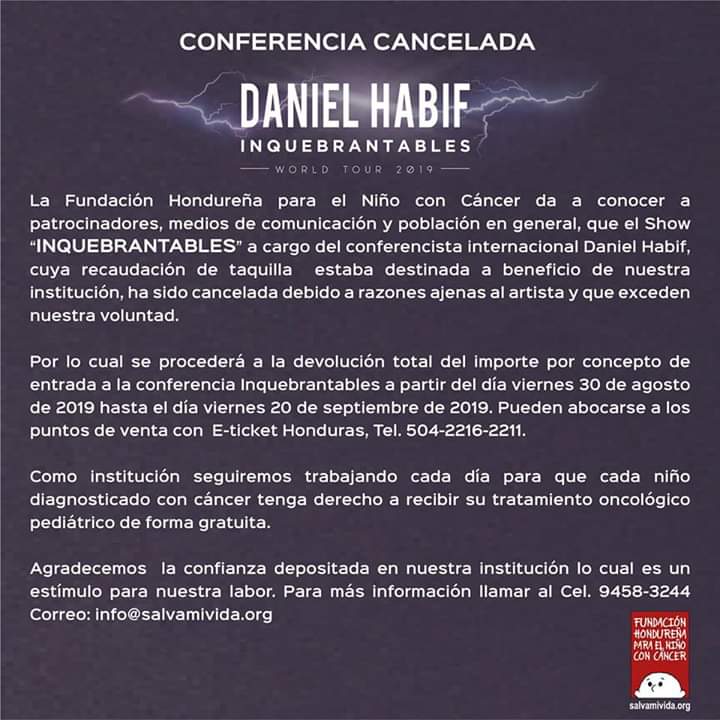 «Esta es la explicación del porqué se cancela mi presentación el día de mañana en Honduras»