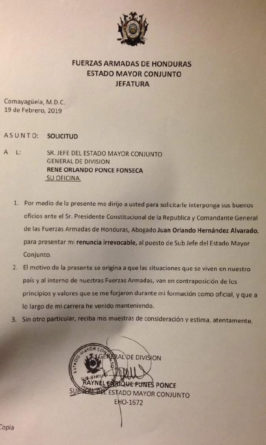 La renuncia fue presentada por el general Funes Ponce al jefe del Estado Mayor Conjunto de las Fuerzas Armadas de Honduras, René Orlando Ponce Fonseca el pasado martes 19 de febrero de 2019.