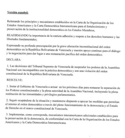 La OEA declara mediante la resolución que las decisiones del Tribunal Supremo de Venezuela de suspender los poderes de la Asamblea Nacional son incompatibles con la práctica democrática y son una violación del orden constitucional de la República Bolivariana de Venezuela.
